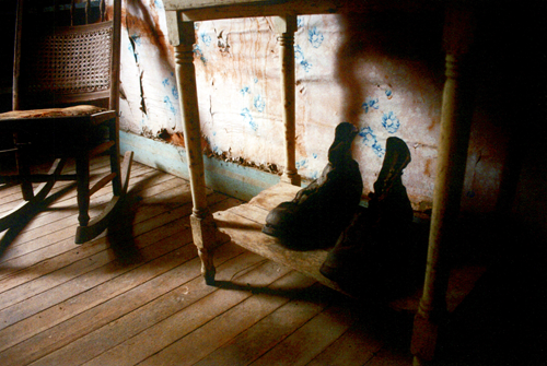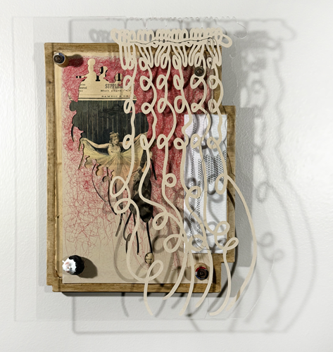 wood, plexi, found newspaper, pen, paper, thread, thread spools, found doll head
