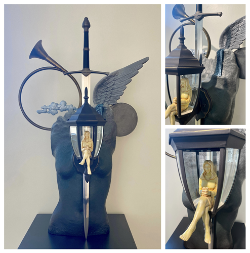 altered mannequin torso, porch light fixture, French horn, sword, metal eagle's wing, steel disc, hand-sculpted cloud, hand-sculpted female figure